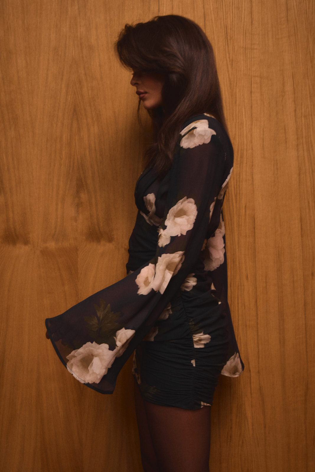The RAVELLE MIDNIGHT BLOOM dress embodies femininity and modern elegance. This short, draped dress with long sleeves is designed to subtly enhance the silhouette while ensuring comfort.