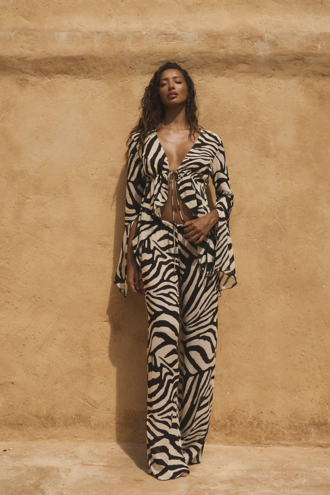 Top Amal confeccionado en tejido de gasa con un llamativo estampado de canalé. La parte superior tiene lazos delicados y volantes sutiles. Combina los pantalones Amal para crear el conjunto de verano de tus sueños.