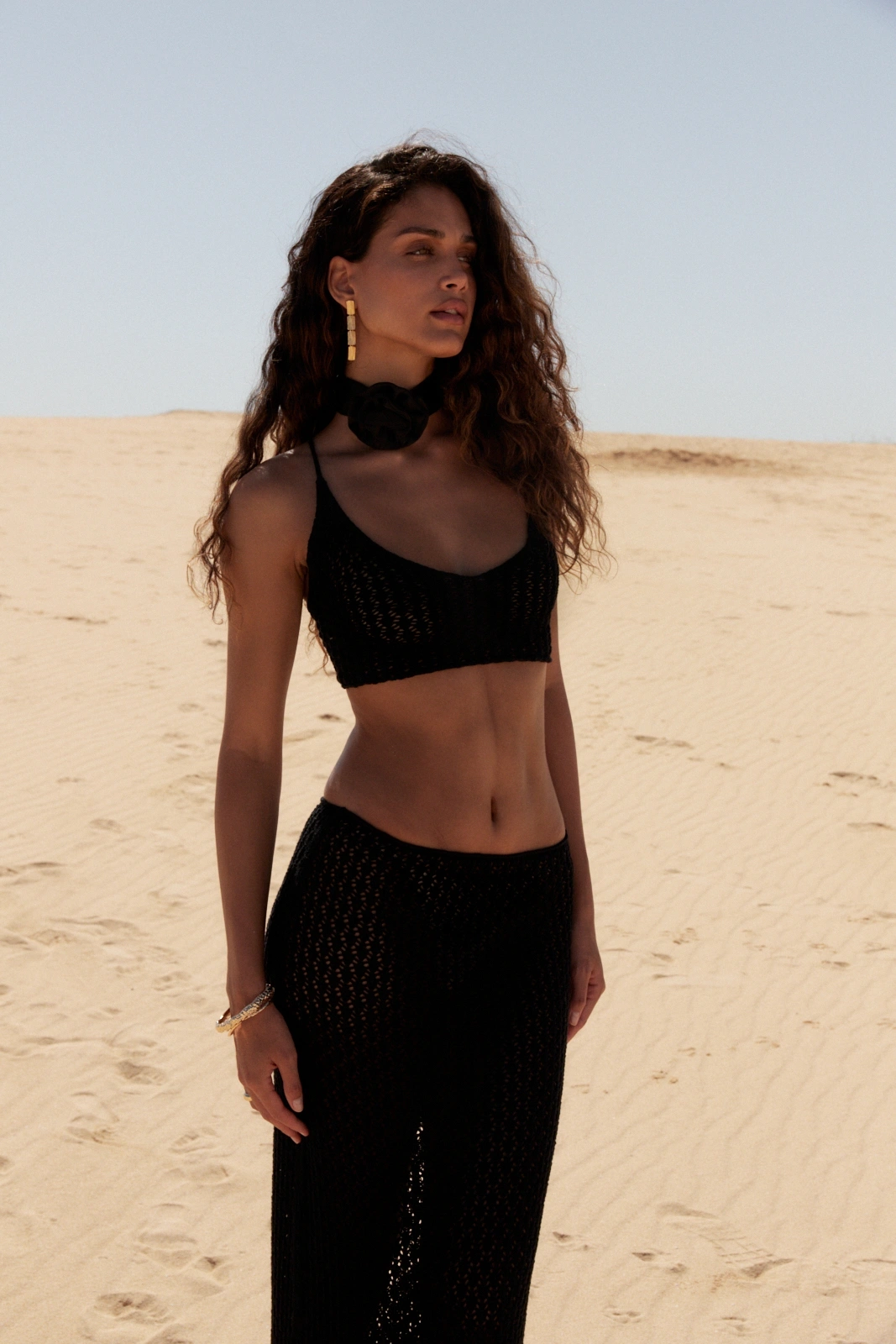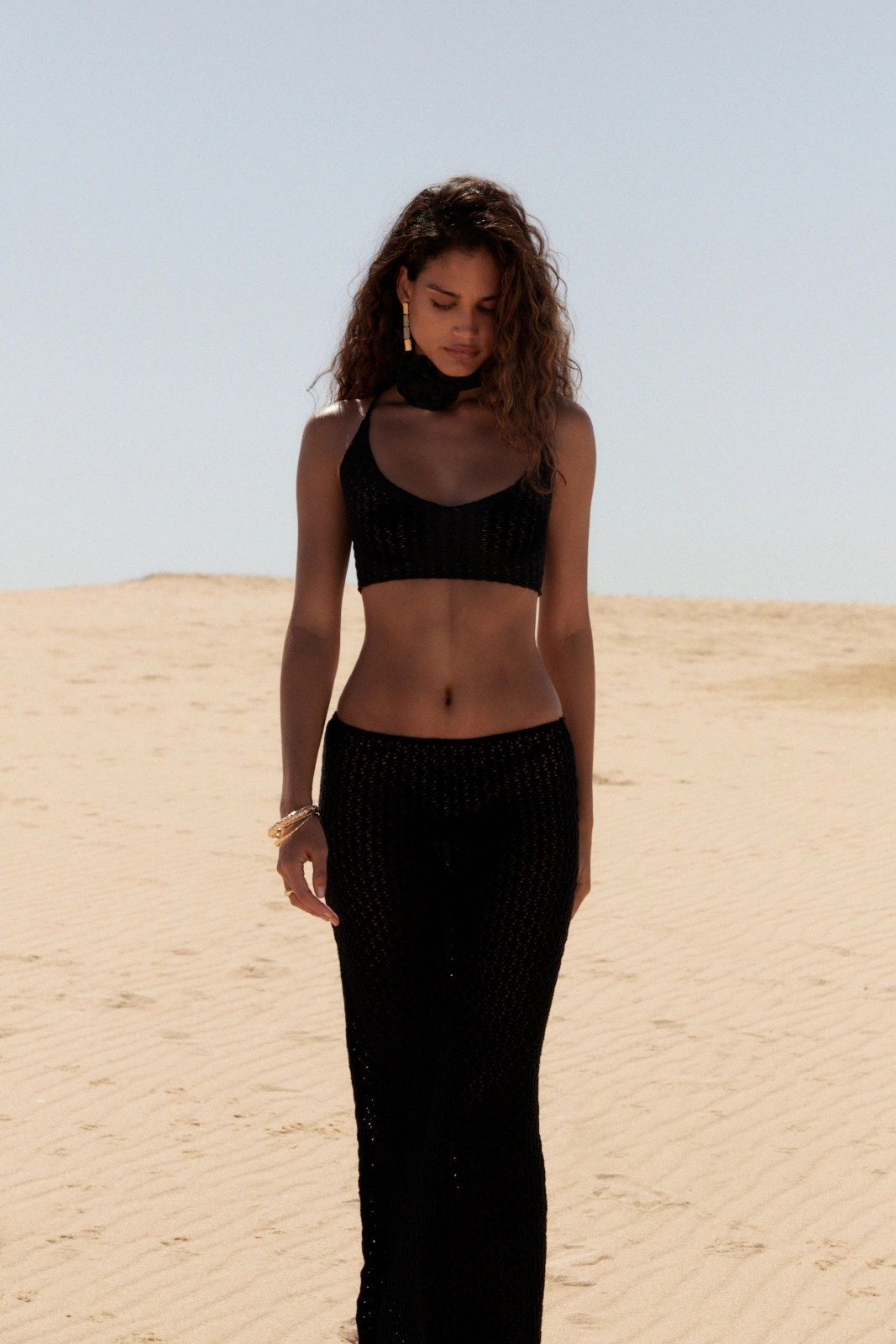 Conjunto de ganchillo en negro clásico, confeccionado en algodón suave de alta calidad. La falda larga y el crop top tienen un lazo ajustable en la espalda, gracias al cual se adaptan a cualquier figura, a la vez que la enfatizan. El conjunto será perfecto para la playa y los calurosos días de verano.