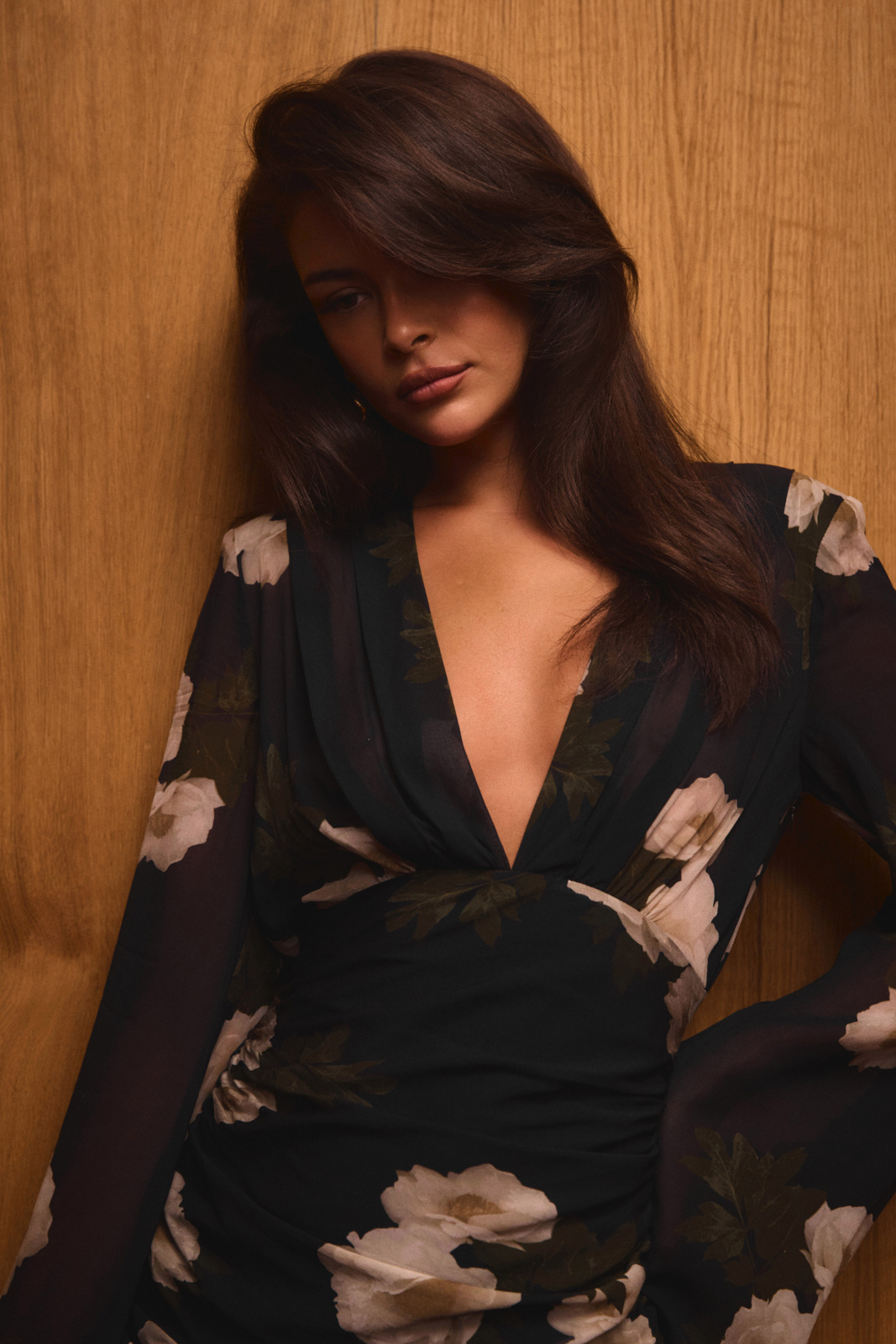 El RAVELLE MIDNIGHT BLOOM es la expresión de la feminidad y la elegancia moderna. Este vestido corto y drapeado con mangas largas ha sido diseñado para realzar la silueta de forma sutil sin renunciar a la comodidad.