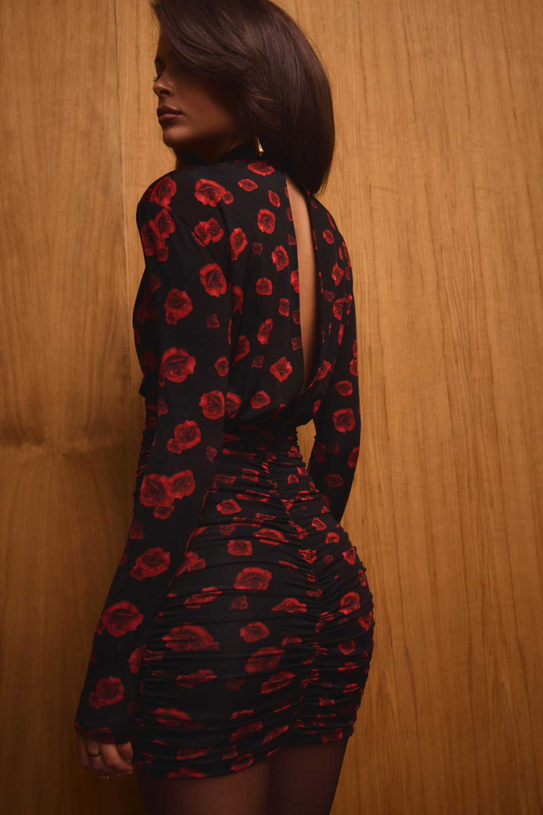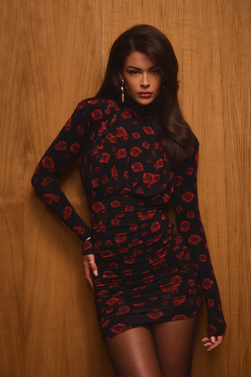 GIORGIA WHISPERS OF ROSE to wyjątkowa mini sukienka, która łączy kobiecą zmysłowość z elegancją. Czarna baza zdobiona czerwonym, kwiatowym wzorem nadaje całości wyrazistego, romantycznego charakteru. Wykonana z miękkiej, elastycznej dzianiny, idealnie dopasowuje się do sylwetki, modelując kształty i zapewniając wygodę noszenia.