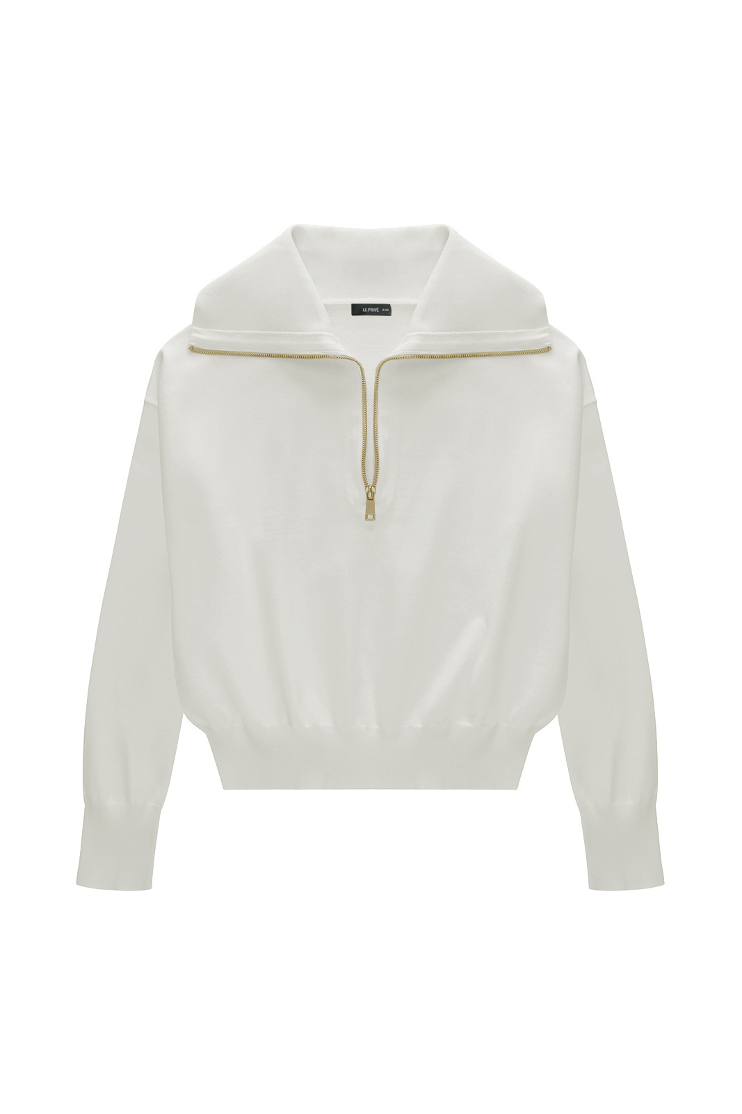 Ivy Zip Blanc to minimalistyczny sweterek zaprojektowany z myślą o nowoczesnym, codziennym szyku. Wykonany z miękkiego, przyjemnego w dotyku materiału, zapewniającego komfort przez cały dzień. Sweter posiada luźny fason, który delikatnie opływa sylwetkę, podkreślając jej naturalny kształt. Wykończony złotym zamkiem błyskawicznym przy stójce, dodaje stylizacji subtelnego charakteru sportowej elegancji. Długie rękawy i delikatnie podniesiony dół swetra sprawiają, że model ten idealnie komponuje się z dopasowanymi spodniami czy spódnicami. Dobierz Ivy Trousers i stwórz stylowy, jednokolorowy zestaw, idealny na co dzień i bardziej formalne okazje. To połączenie łączy nowoczesną elegancję z wygodą.